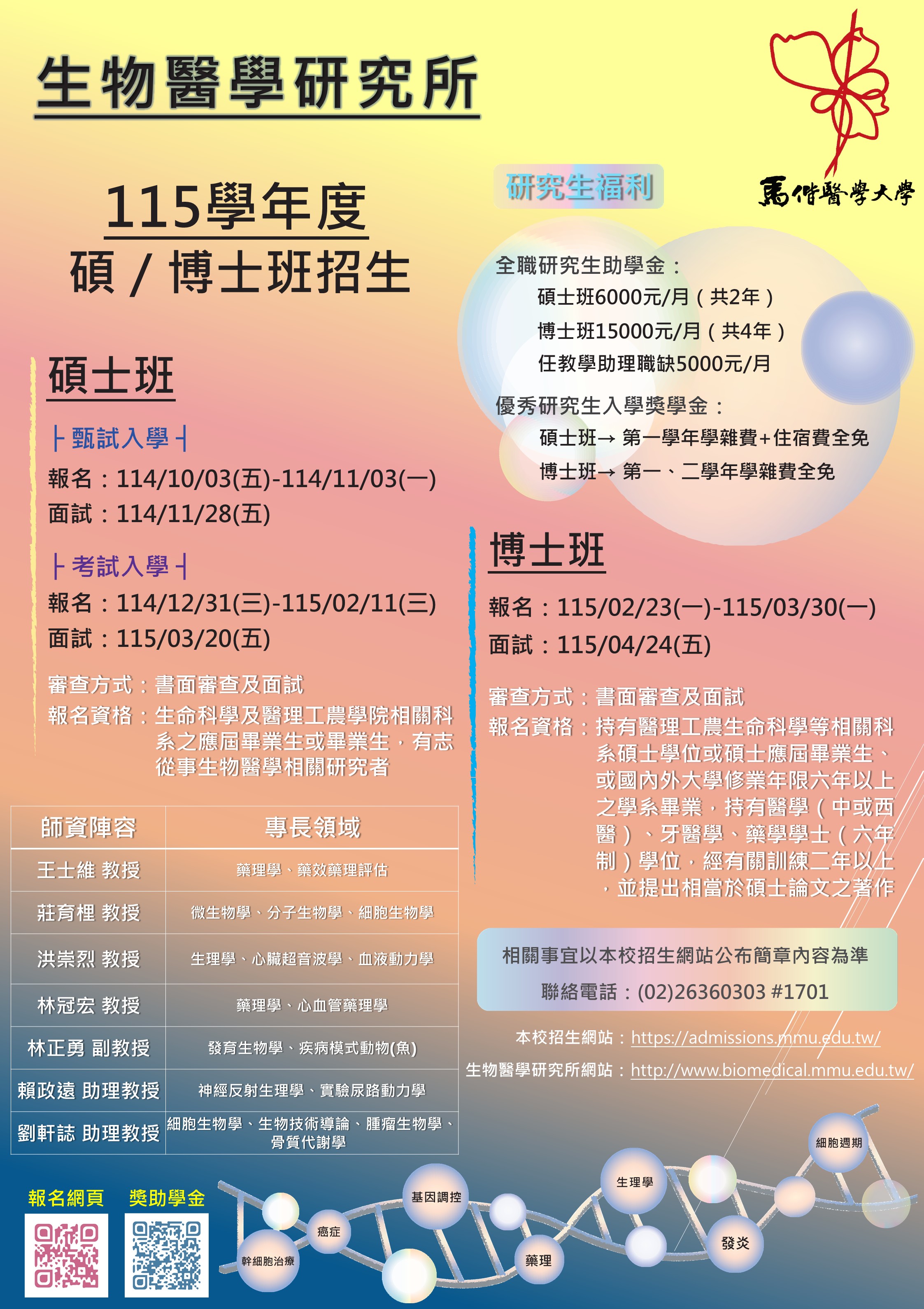 - 2018/12/21 【生醫所研討會】:【當代生物醫學新知國際研討會】將於12月21日17:30-20:30假四樓遠距暨示範教學中心舉辦,敬請老師蒞臨。
