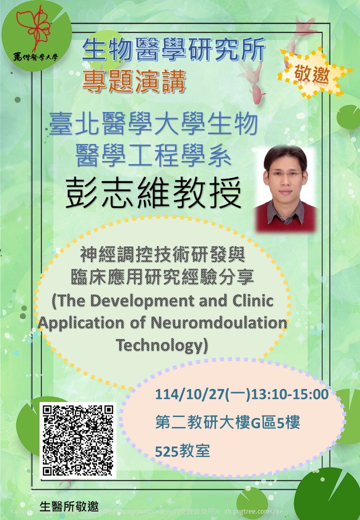 [2025/10/23] 【專題演講預告-同步視訊】1141027敬邀「臺北醫學大學生物醫學工程學系 彭志維教授」 蒞臨演講