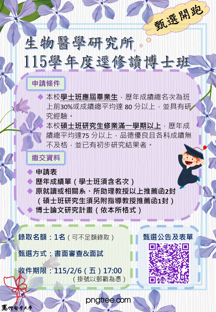 115學年度生醫所碩/博士班招生 碩士班甄試報名時間:114/10/03-114/11/03 (114/11/28面試..